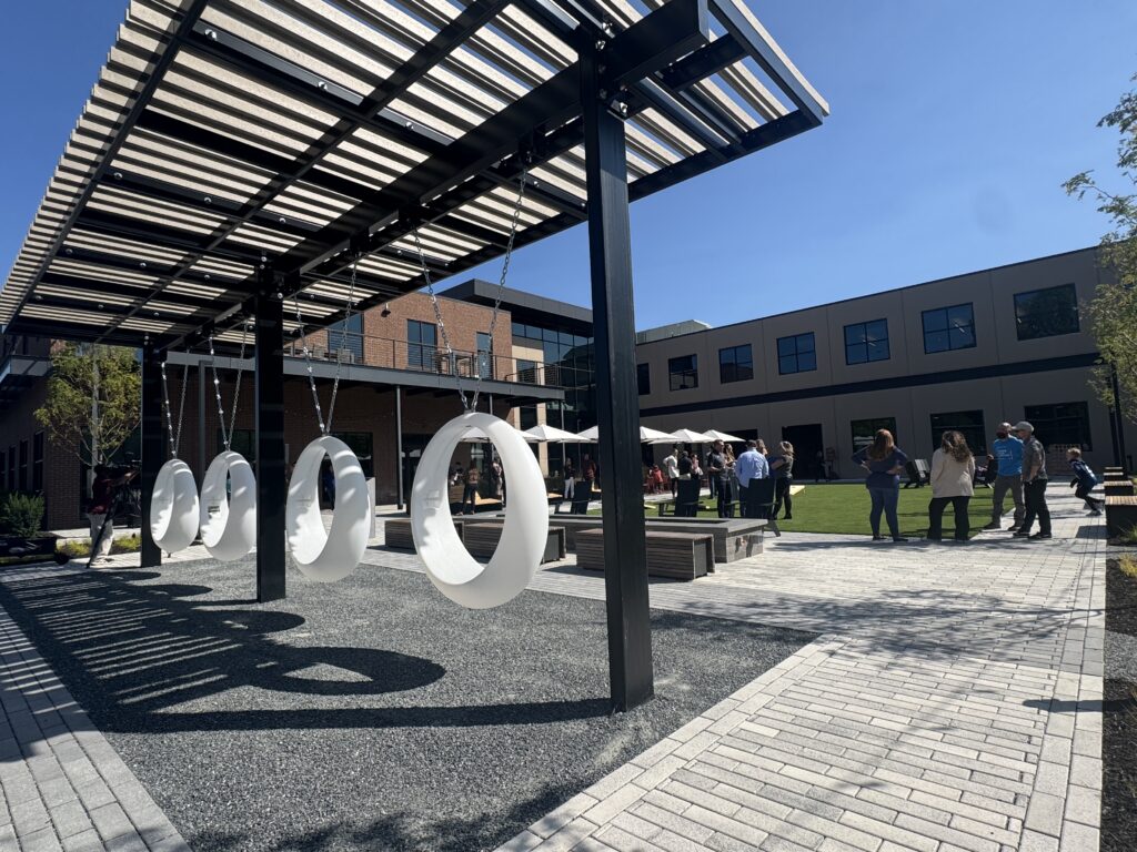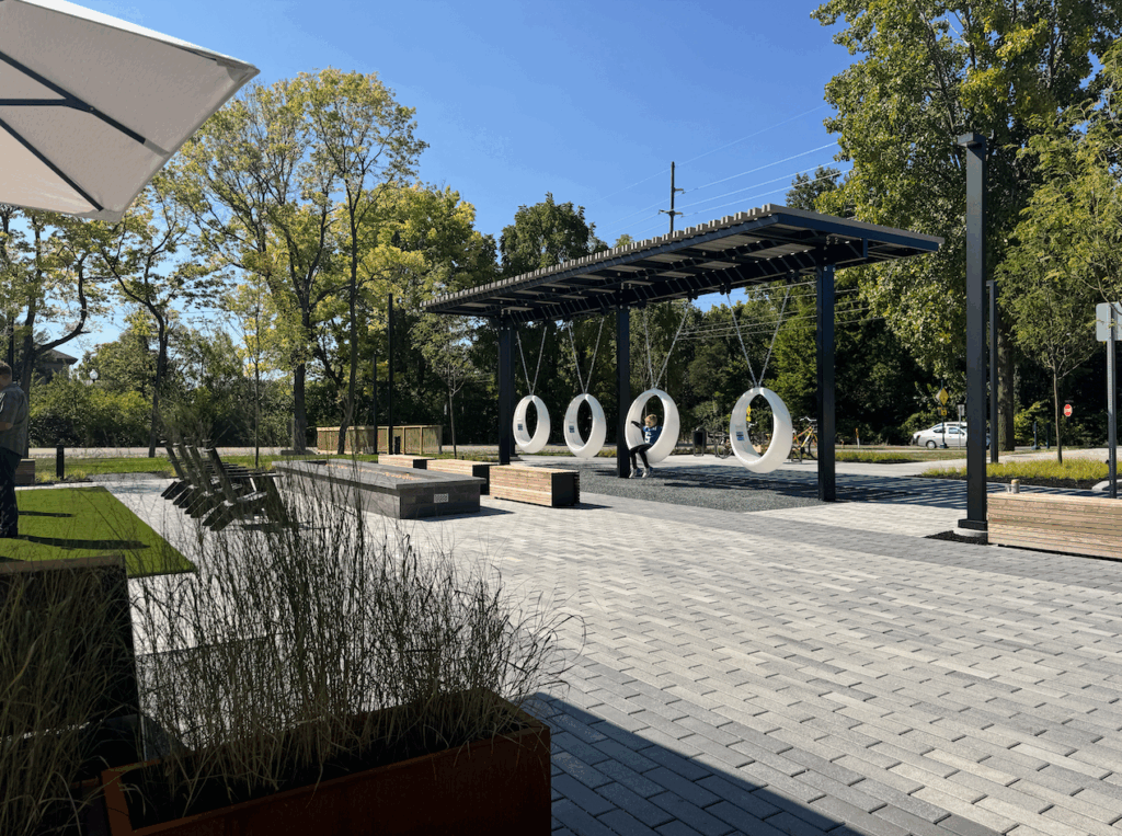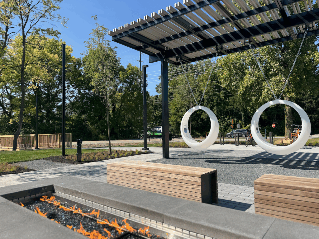 The plaza extends onto the Hub & Spoke property, also home to the Fishers Parks headquarters and Fishers Maker Playground, and features a multi-use space for community gatherings and recreation with a courtyard with public seating and tables, a large communal fire pit, an open green lawn, swings, and improved trail accessibility.