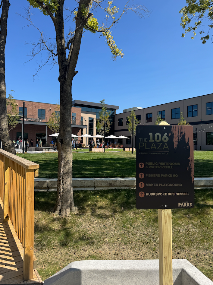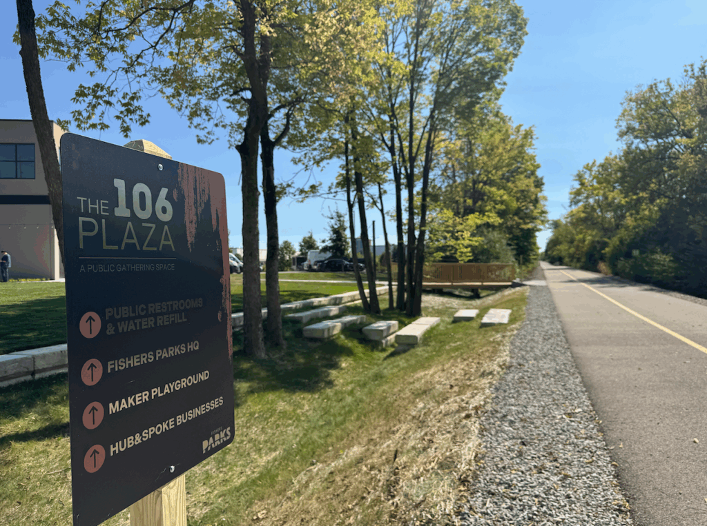 Fishers Parks, in partnership with Hub & Spoke, opened the The 106 Plaza in summer 2025 at 106th Street and the Nickel Plate Trail, Strengthened by IU Health.